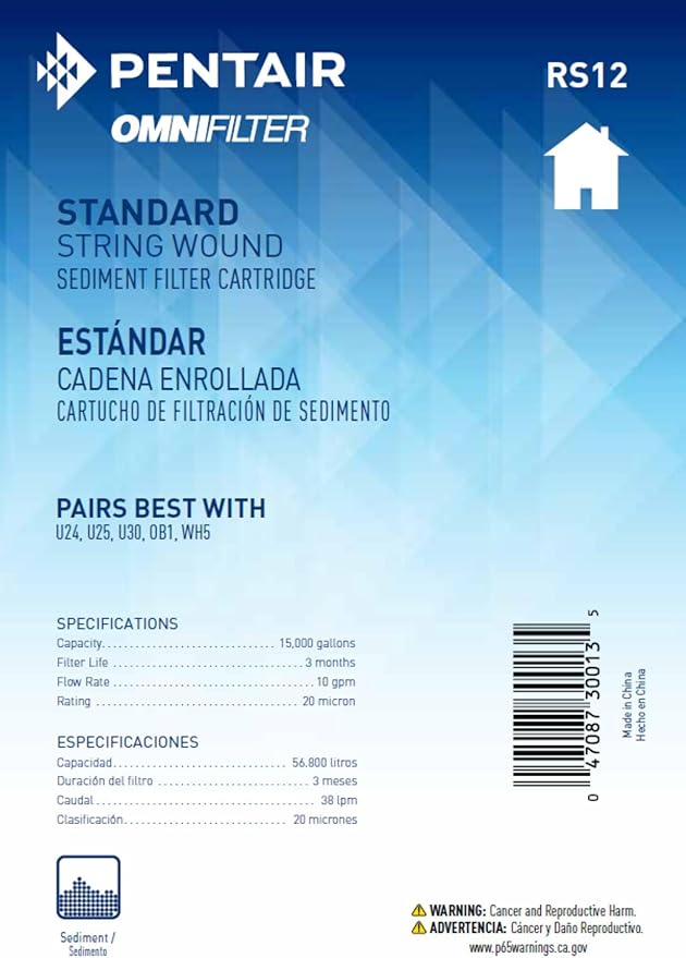 Pentair OMNIFilter RS12 Sediment Water Filter, 10-Inch, Standard Whole House String Wound Sediment Replacement Filter Cartridge, 10" x 2.5", 20 Micron, Pack of 1
