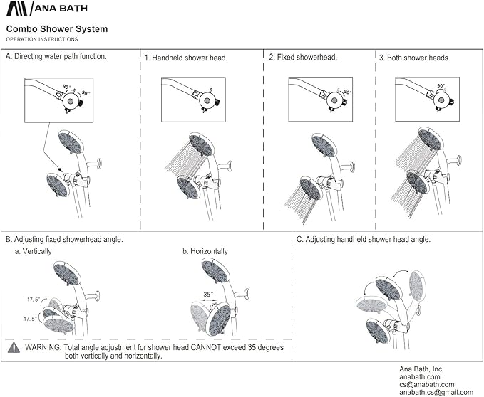 - LARGE/WIDE DIVERTER with BRASS CONNECTOR: Angle-adjustable overhead bracket | Wider and longer diverter than industry standard for sleeker look (no more cramming look) | Turn dial to direct water to handheld shower head only, fixed showerhead only, or both together.