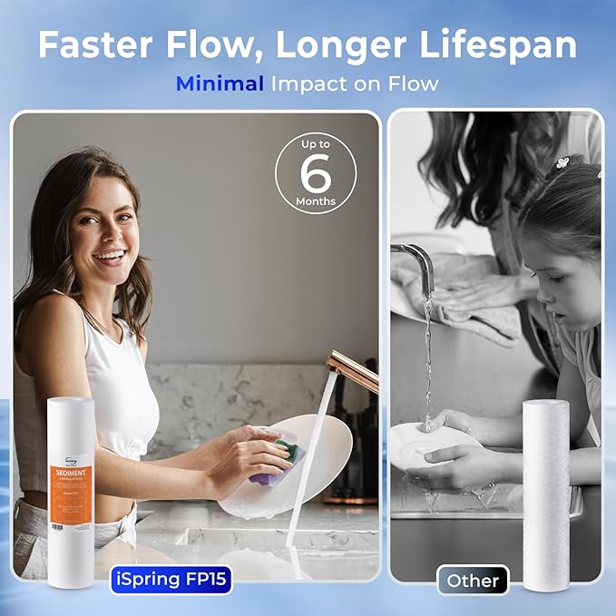- Versatile Micron Options: iSpring offers a wide range of micron sizes to suit your specific needs. The FP series high capacity polypropylene sediment filter is able to achieve filtration down to 1, 5, 10, 20, 50 microns. They have a capacity that is enough to supply a family of four with clean water for half a year (depending on your water quality).