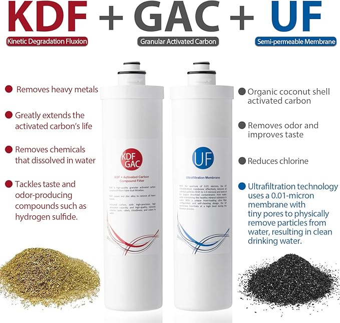 - 4-Stage ULTRAFILTRATION SYSTEM: PP Sediment Filter (5 microns) removes larger particles like rust, sand, dirt. Ultrafiltration membrane contains hollow fiber membrane technology with a pore size of just 0.01 microns. KDF and GAC Filter provides much better control of particularly problematic contaminants including chloramine, hydrogen sulfide, heavy metals, and other compounds. Fine Activated Carbon Filter provides final polishing.