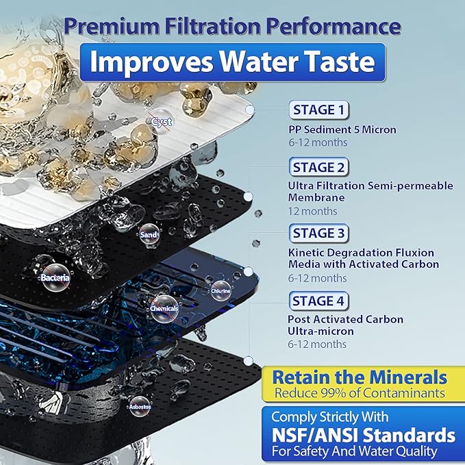 - SUPERIOR PERFORMANCE: The advance 4-stage design, which includes both Ultrafiltration and KDF/GAC stages, removes up to 99% of chlorine and chlorine treatment by-products, lead, and much more, while retaining minerals. Noted: This system is NOT a Reverse Osmosis water filtration system and does NOT lower TDS.