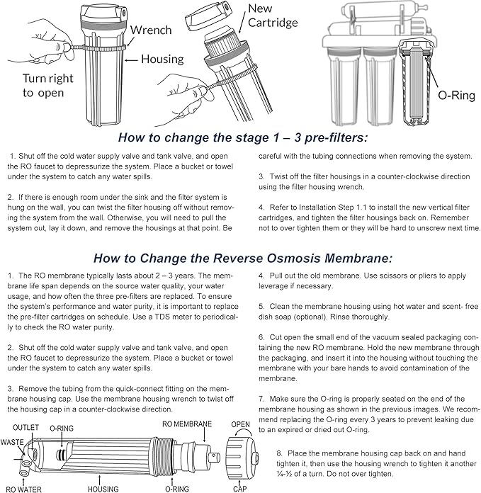 - 1-Year Water Filtration Replacement Pack: This pack contains individually wrapped high-capacity filter replacement cartridges designed for RO/DI water filter systems, providing a full year of filtration. The pack includes 9 filters: 2x sediment filters, 2x granular activated carbon filters, 2x carbon block filters, 1x post-carbon filter, and 2x DI filters