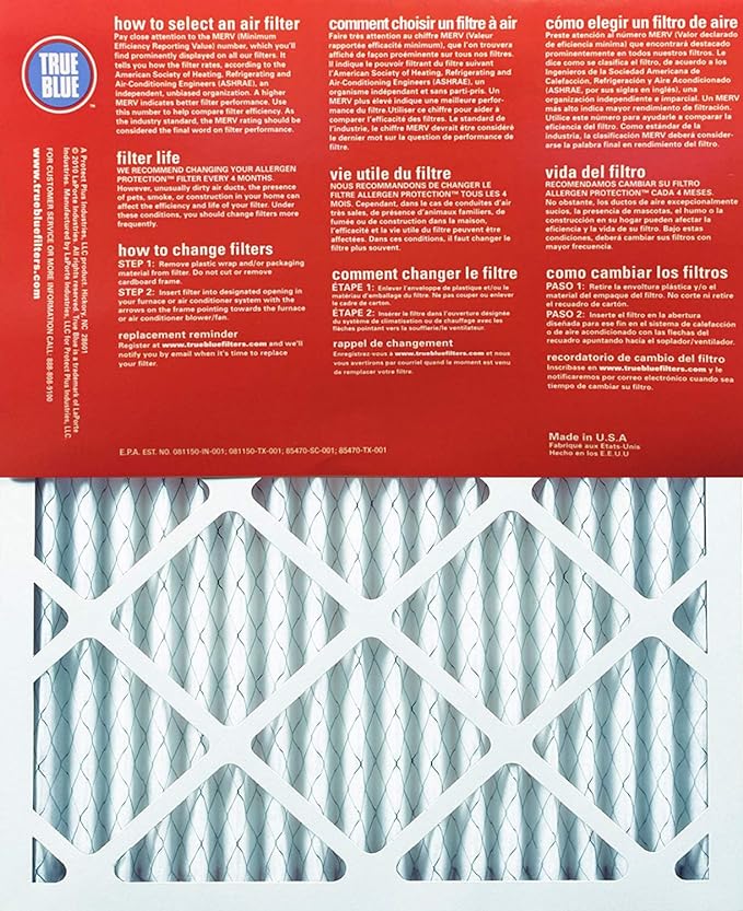 - CLEANER INDOOR AIR: The True Blue MERV 11 Pleated HVAC Furnace Air Filter is designed for residential use to improve and freshen indoor air quality by reducing airborne contaminants and intruding microscopic particles. This filter is compatible with almost any brand and is appropriate for use in air conditioners, furnaces, heat pumps and HVAC units.