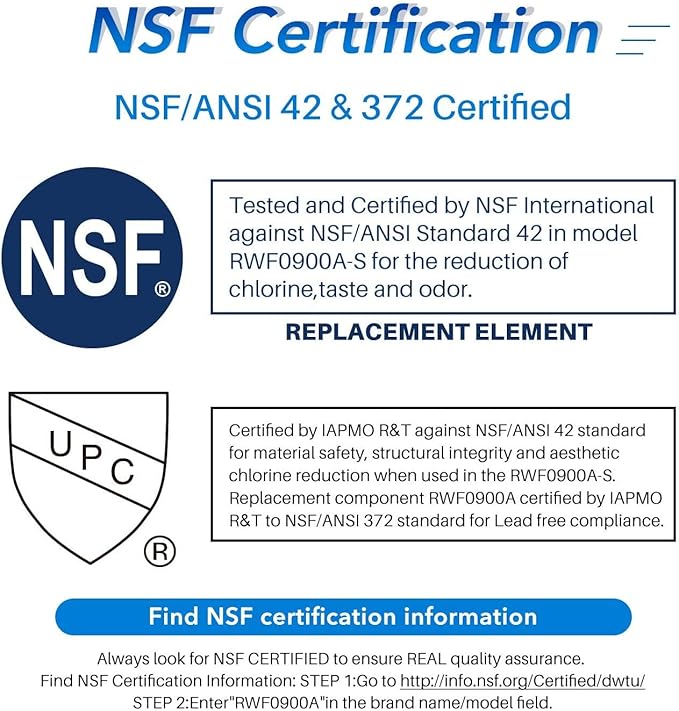 - External Testing Certification : NSF/ANSI 42 and NSF/ANSI/CAN 372