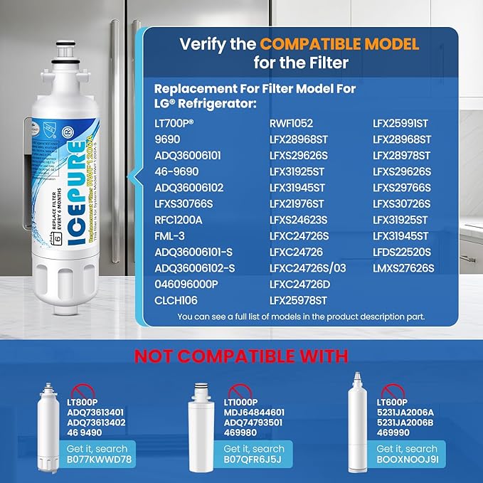 - Compatible Models-Cartridge ADQ36006101-S, ADQ36006101S, ADQ36006102-S, ADQ36006102S, OEM LT700PC, LT700PCS, KENMORECLEAR / SEARS Premium 46-9690, OnePurify RFC1200A RFC 1200A, ICEPURE RWF1200A, Water drop WD-LT700P, Pure Line PL-500 PL500, PUREPLUS PP-RWF1200A, GOLDEN ICEPURE, WATER SENTINEL WSL-3, HDX FML-3, Tier1 RWF1052, Refresh R-9690, Denali Pure WF-LT700P, K&J KJ700, Aqua Fresh WF700, PureH2o PH21410, Mist CWMF041, Water Filter Tree WLF-01, Neo-Pure NP LT700P.