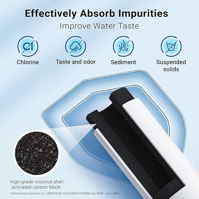 - High-quality filter material: AQUA CREST brings you an upgrade with a 100% selected coconut shell carbon block. The surface area is larger. There are also more micropores to increase the filtration process’s efficiency, giving no chance to impurities like bad taste and odor, sediments, chlorine, and heavy metals tested by third lab.