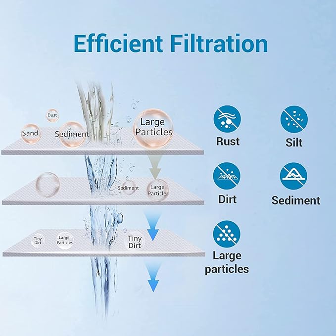 - Efficient Filtration: AQUACREST whole house water filter adopts food-grade material to remove large particles and sediments larger than 5 microns in diameter effectively.