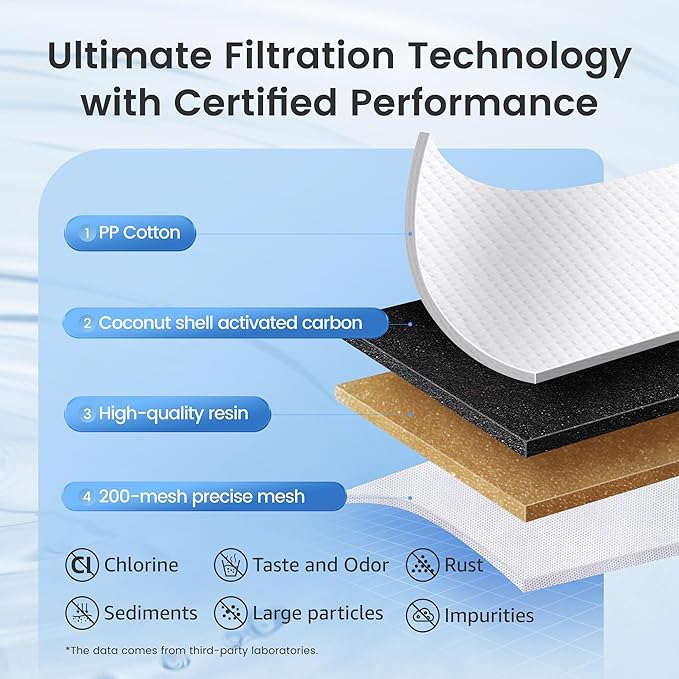 - [4-stage Filtration] This filter adopts a pre-filter layer with coconut shell activated carbon and high-quality ion-exchange resin to ensure the maximum filtration and clean water possible. Tested by a third-party lab, it can efficiently reduce chlorine, rust, taste and odor, and sediments.This filter DOES NOT lower TDS value.