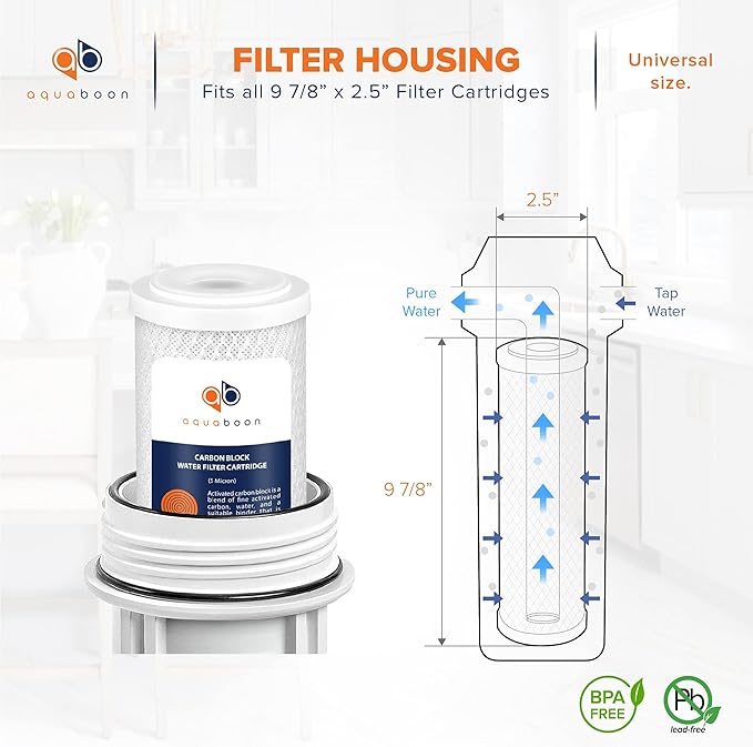 - Ultimate Purity with Activated Carbon: Aquaboon’s carbon water filter is made from high-purity coconut shell activated carbon. This 10 x 2.5 water filter effectively removes chlorine, chemicals, and bad odors, providing fresh filtered water.