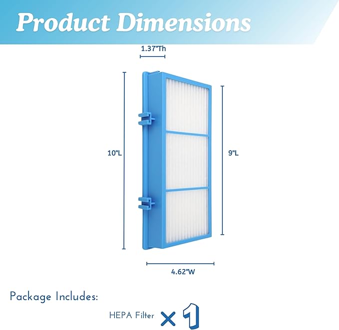 - Filter dimension: 1.2 x 10 x 4.6 inches. 1 HEPA filter included.