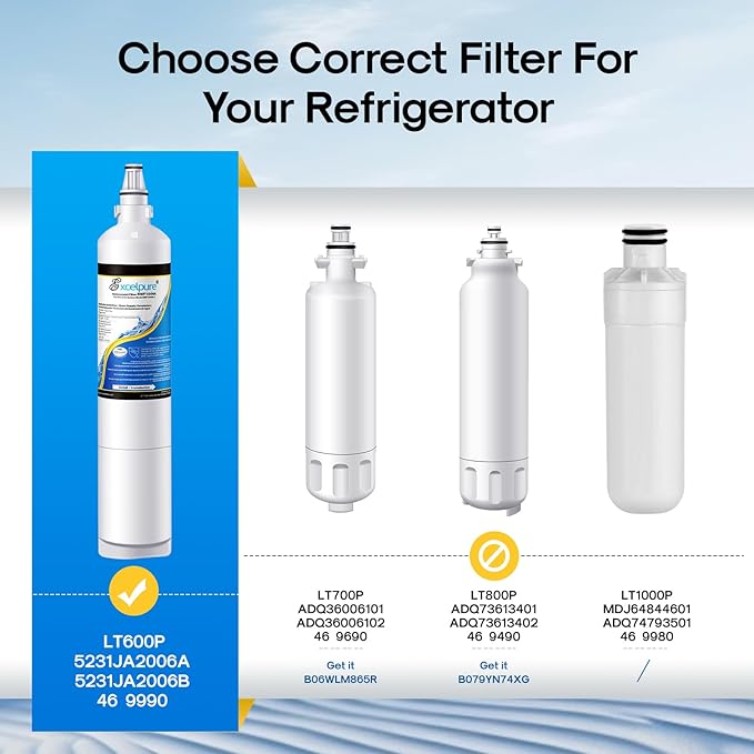 - Replacement Models- LG LT600P/LT600PC,5231JA2006,5231JA2006A-S, 5231JA2006b-S,5231JA2006-S,KenmoreClear 9990,46 9990,Water Drop WD-lt600p, AmazonBasics AMZN-LT600P-S,Refresh R9990,EcoAqua EFF 6003A, AQUACREST AQF-LT600P, Ice pure RWF1000A,Odoga WFEK00013,Swift Green SGF-LA50, HDX FML-2,Denali Pure WF-LT600P,OnePurify RFC1000A,Clear Choice CLCH104,Insignia ns-lt600p,Tier1 RWF1051,PureH2O PH21400,Excelpure EP-LT600P, Culligan CW-L2,Supco WF300,Dista DWF-10.EXCELPURE is an independent brand.