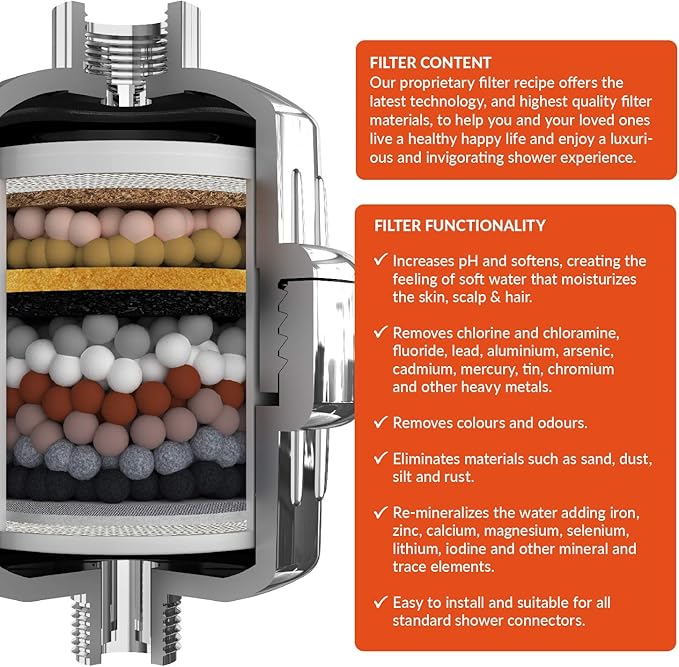 - RE-MINERALIZES WATER FOR HEALTHY SKIN & HAIR: Our pH Energise Filter is designed with utmost care to make showering pleasant for you. Added with coconut shell-activated carbon and mineral stones, the shower filter remineralizes the water giving you healthier hair, scalp and skin. Its multi-stage filter adds a pleasant smell to the water to invigorate your senses.