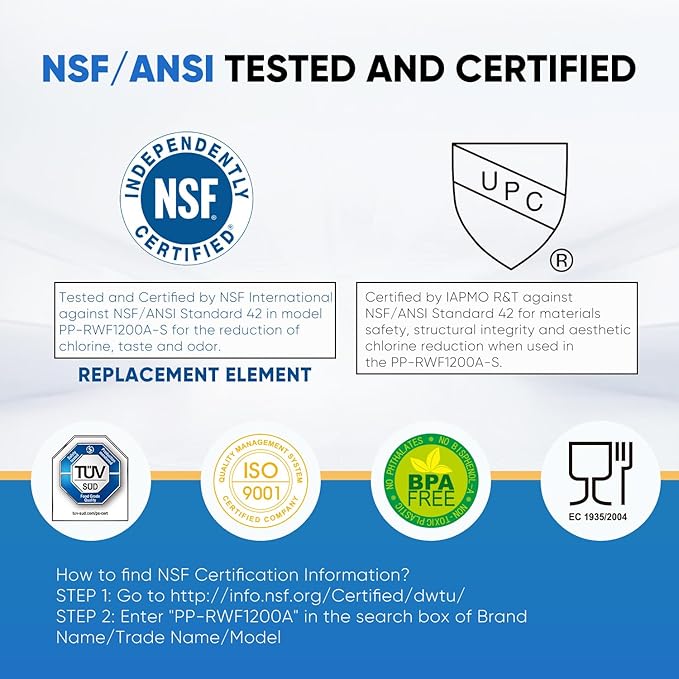 - ❄️Authoritative Certifications - The filter is certified by NSF/ANSI 42 for reducing chlorine, taste, and odor, and NSF/ANSI/CAN 372 for lead-free compliance. It removes 99% of chlorine, odor and improves water taste significantly. It also certified by REACH, Canadian CSA, BPA Free and Australian Water Mark. Only select products with authoritative certifications for your households.