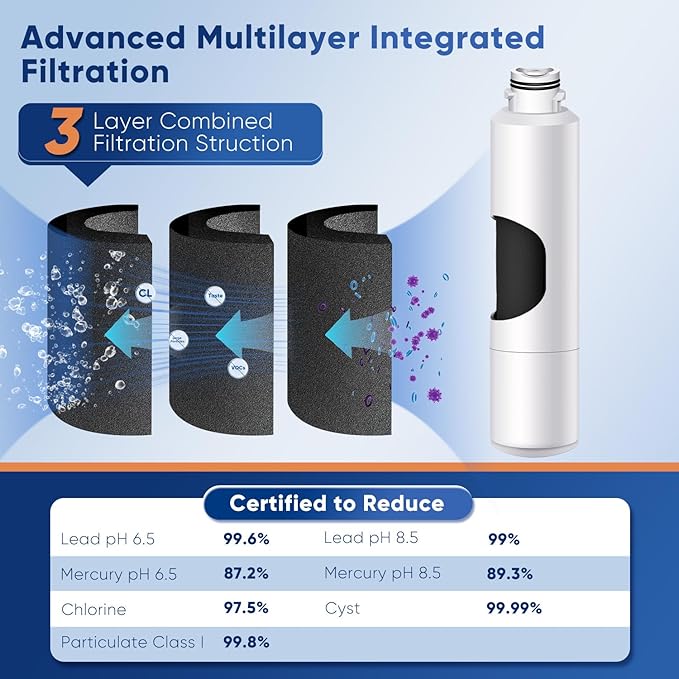 - ❄️ Authoritative Certifications - This filter is certified by NSF/ANSI 53,42 for reducing heavy metals and filters out 97.5% Chlorine, 99.6% Lead, and 89.3% Mercury. It is also certified by NSF/ANSI/CAN 372 for lead-free compliance, significantly improving the taste of water. The product has also obtained certifications from several esteemed organizations, such as the Canadian CSA, BPA Free, and Australian Water Mark.