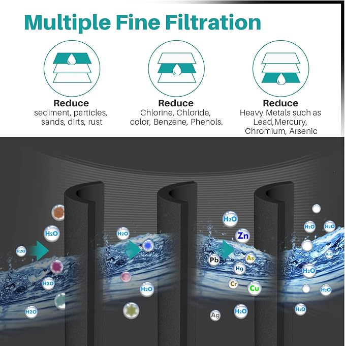 - [Efficient Filtration Capacity]- The filtering effect of this product is perfect, which can remove many impurities in the water. Certified by NSF/ANSI 42 can remove Chlorine, Bad Taste, Organic Compounds, Odor, Particulate Class I, Rust, and other solid particles. Certified by NSF/ANSI 53, it can remove Cysts, Lead, Heavy metal impurities, etc. Effectively removing heavy metal impurities in the water is the most notable feature of this water filter