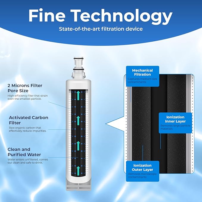 - Filtration Process: The filter material in this filter is a selected coconut shell carbon block, with 2x larger surface area and more micropores. The water passes through the pores of the filter, The water is further purified through two separate stages of ionization filtration that take place as the water passes through the carbon block to your refrigerator. The filter material in the Pureline refrigerator filter improves the overall taste of your water Unlike the cheap and mixed carbon block.