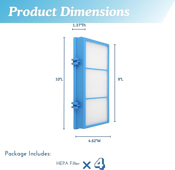 - Filter Dimension: 1.2 x 10 x 4.6 inches. 4 True HEPA filters included.