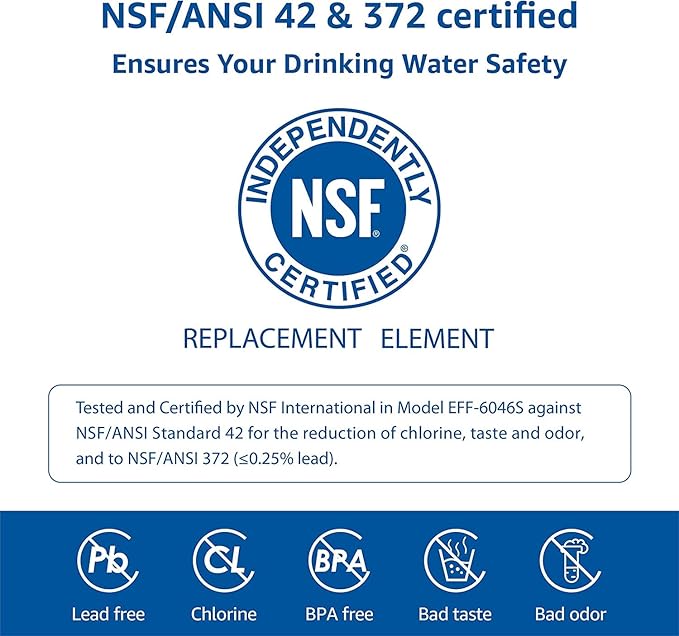 - Premium filter material: Waterspecialist selected BPA-free and food-grade filter housing that passed NSF 372 certification for lead-free filtration. We also adopt natural coconut shell carbon block that contains surface area and micropores. Thus, the filter cartridge can reduce chlorine, bad taste and odor.