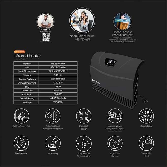 Heat Storm Phoenix HS-1500-PHX, Infrared Space Heater with Attachable Feet, Remote Control, Energy Efficient-750-1500 Watts, Gray Floor or Wall