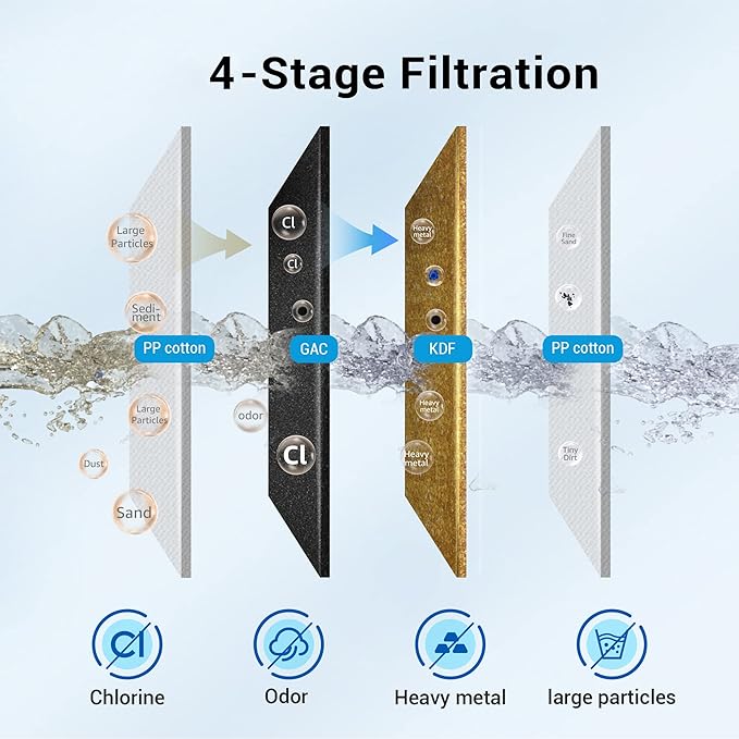 - 4-stage filtration: AQUA CREST shower filter uses multiple filtration media, including a pre-filter layer, advanced kinetic degradation fluxion, granular activated carbon and pp cotton to effectively reduce contaminants like chlorine, heavy metals, sulfur odor, sediment and large particles. It can reduce PFAS substances, providing you with cleaner and safer water. The granular activated carbon is made from natural coconut shells. Please confirm whether you are allergic to it .