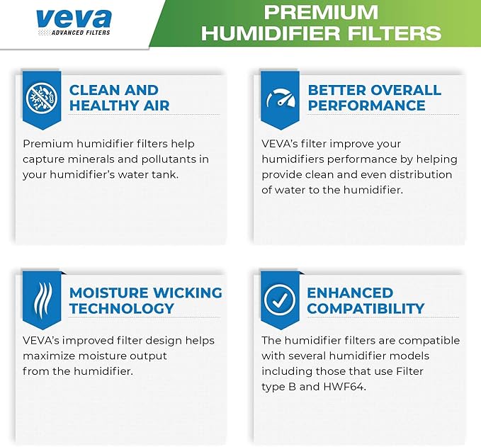 - PREMIUM QUALITY - VEVA’s improved wick filter design maximizes moisture output from the humidifier. It captures mineral from hard water to stop white dust and features an outer layer of activated charcoal to fight odor. These filters are ideal for anyone who needs a clean and effective humidifier experience.