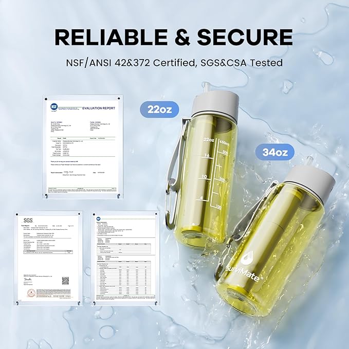 - [5-Stage Filtration] - The Survimate water filter bottle utilizes advanced composite filter technology to effectively reduce a wide range of contaminants. The filter has passed authoritative NSF/ANSI 42 certification, it employs a coarse filter screen, a 0.01μm hollow fiber UF membrane, a sediment PP membrane, purification beads, and activated carbon fiber to reduce chlorine, unpleasant odors, heavy metals, sediment, soil, organic matter, and other impurities.