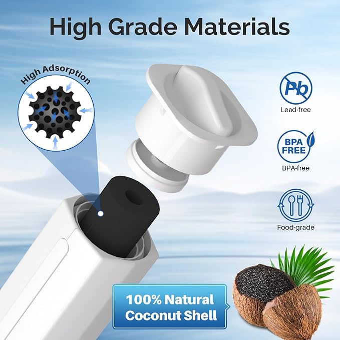 - [Premium Materials for Maximum Safety] Made with natural coconut shell carbon and BPA-free food-grade housing. Independently tested by an independent third-party laboratory to reduce heavy metals, mercury, copper, cadmium, chromium, and other contaminants.