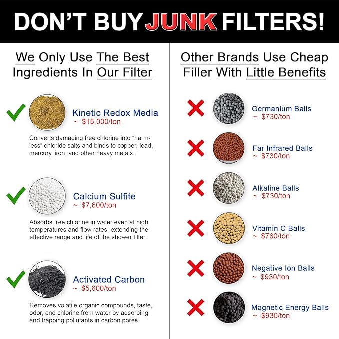 - š¦ Unlike Other Shower Filters That use cheap filler material with little benefits, the Aqua Elegante Shower Fliter only uses Ingredients Proven to Remove Harmful Chemicals. We combine kinetic redox material, calcium sulfite, and activated carbon into a unique blend that specializes in removing free chlorine, heavy metals, and other toxic yuck in your water supply. Don't be fooled by "extra stages" of cheap filler in other showers filters.