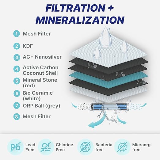 - 8 STAGES: Stage 1/2 / KDF removes chlorine, organic matter, heavy metals, rust, bad taste, odor/ Stage 3 Active Carbon removes chlorine, chemicals, impurities/ Stage 4 ORP balls are anti-oxidant that help human cells and metabolism/ Stage 5 Bio Ceramic improves blood flow/ Stage 6 Mineral Stone adds healthy minerals calcium, magnesium, sodium, potassium/ Stage 7/8 Mesh Filters block larger particles at top and bottom of filter.