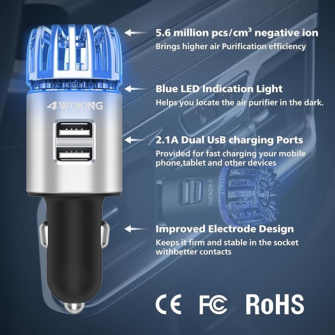 - Powerful Odor Eliminator: 4WDKING Ionic Air Purifier can release up to 5.6 million negative ions per cm3, which can immediately remove bad order and smell from the car. These high-density negative ions also attach dust, pollen, allergens, bacteria, viruses, and atmospheric particulate matter (PM2.5) commonly found, and smoke to increase air quality and reduce the odor and smell.
