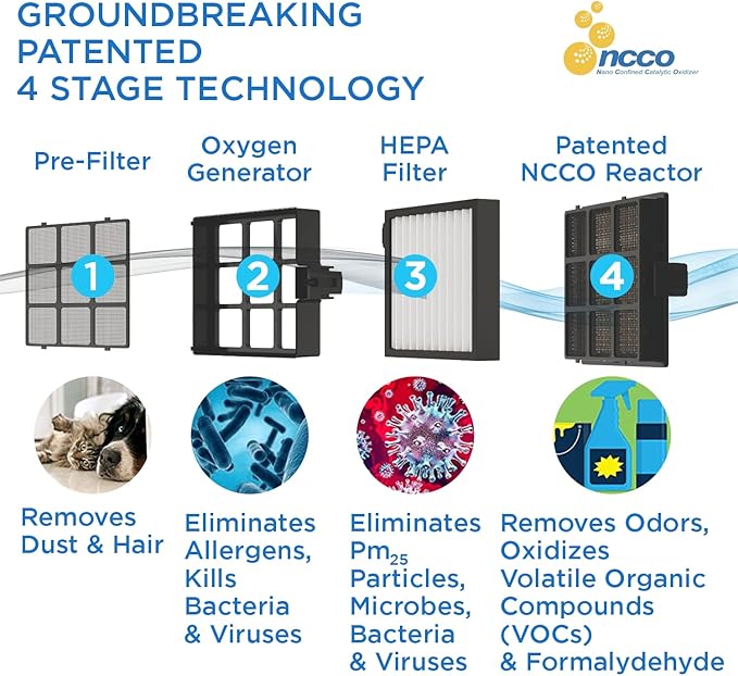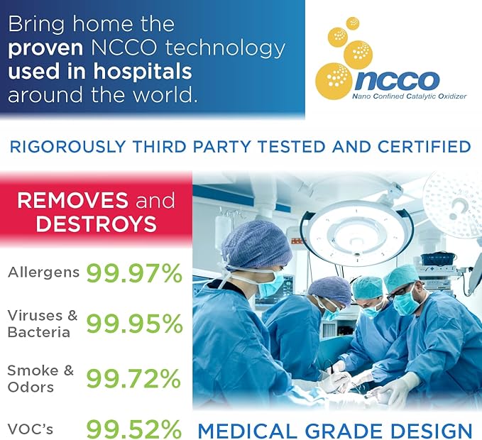 - Patented NCCO Technology: Unlike standard HEPA filters that only trap pollutants, our home air purifiers feature patented NCCO technology that breaks down harmful particles into harmless compounds.