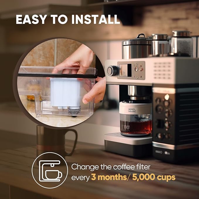 - ☕EASY INSTALLATION & UP TO 5,000 CUPS – Designed to match the original filter system with a simple click-and-go setup. Each filter delivers fresh water for brewing up to 5,000 cups of coffee before replacement.