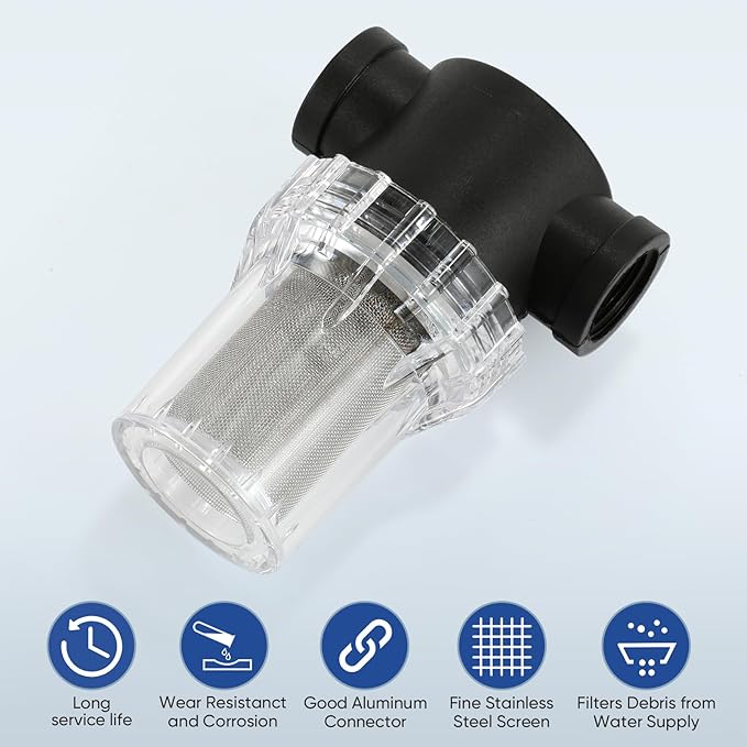 - Easy to Install: Simply connect one end of the line pressure washer filter for the garden hose to the water inlet of your pressure washer or outdoor water faucet. Then, connect the garden hose to the other side of the fixture, effectively utilizing it as a garden hose strainer.