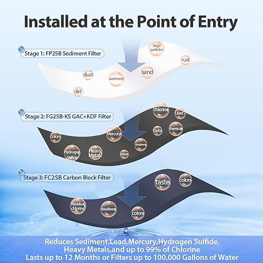 - PROTECT YOUR FAMILY AND APPLIANCES - The 2nd-stage FG25B-KS 20” x 4.5” compound filter removes chlorine, lead, mercury, hydrogen sulfide, heavy metals, pesticides, herbicides, odors, and other harmful chemicals. A whole house water filter system that protects your family and appliances.