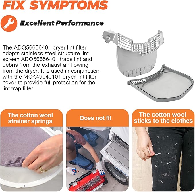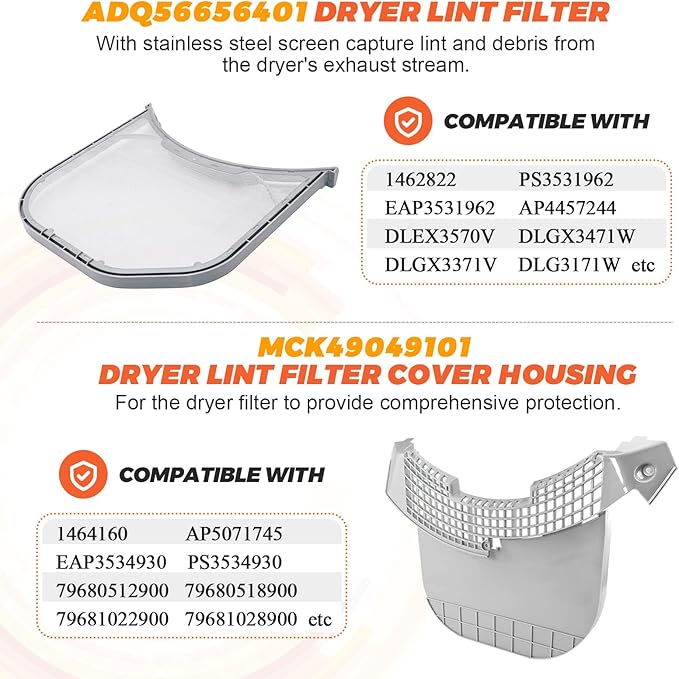 - γπππ€π±π²π²π±π²π°π¬π πππ‘π§ ππππ§ππ₯π¦&π πππ°π΅π¬π°π΅ππ¬π πππ‘π§ ππ’π¨π¦ππ‘πγIncludes 1 x ADQ56656401 Lint Screen Filter and 1 x Mck49049101 Lint screen housing.β€Replace the adq56656401 dryer lint filter with the mck49049101 dryer lint screen protector together, if your lg or kenmore dryer vent is clogged, the lint filter pops out or gets stuck on the clothes, ADQ56656401 dryer lint filter replacement and MCK49049101 dryer lint screen cover fits together easily and will not loosen when placed in the groove. If your lint filter was crackedand it noeded to bereplaced,Lint filter was damaged or Clothes would get caughton lint filter and wouldtwist into a knot you could use it