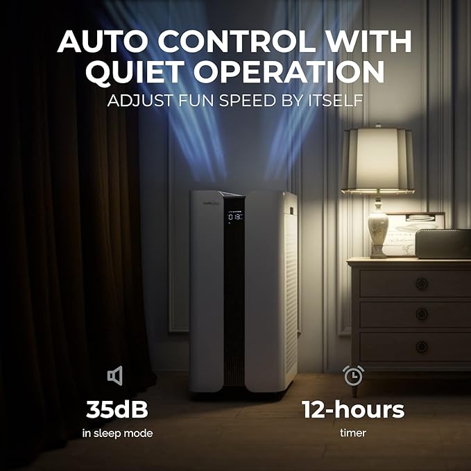 - SMART AUTO MODE&QUIET OPERATION: The smart air purifier will adjust its fan speed automatically based on your real-time air quality at the smart mode. Quiet enough to sleep even with such a large CADR - at just 35dB on the lowest setting. Quiet air purifier for bedroom,living room,office, classroom