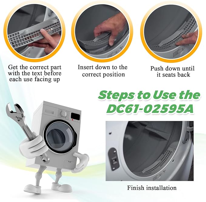 - ✔✔ 【EASY TO INSTALL】Disconnect the power before install DC61-02595A Dryer Lint Trap Filter Screen. Wear work gloves to protect your hands. You can find the repair video on the Internet and follow it to install samsung clothes dryer lint trap. To avoid gaps when installing the samsung dryer lint trap replacement dve45r6100c/a3, clean the filter slot thoroughly. Please Note: periodical replacement of your lint filter will help extend the lifespan of your appliance and save your time to dry your clothes normally