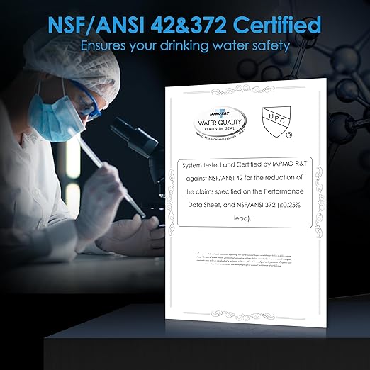 - [NSF/ANSI certified] The under sink water filter is NSF/ANSI 42 certified to reduce chlorine, taste, and odor and NSF/ANSI 372 certified for containing lead-free materials. Besides, it can reduce PFAS, PFOA/PFOS. Every drop of water is clean and safe.