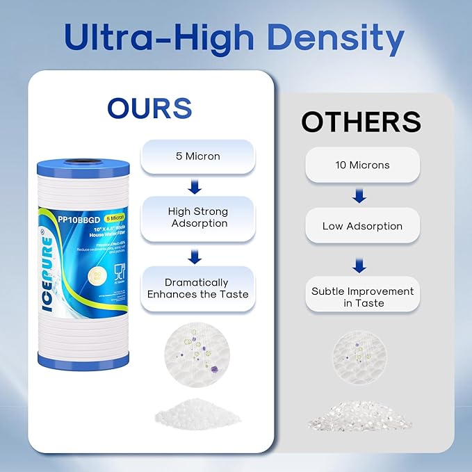 - Efficient Filtration Capacity ‒ ICEPURE Whole House Heavy Capacity Sediment and Activated Carbon Water Filters combine two filtration functions, not only reducing particles, sediment, rust, and limescale but also reducing 99% of Chlorine in water, making it taste great.