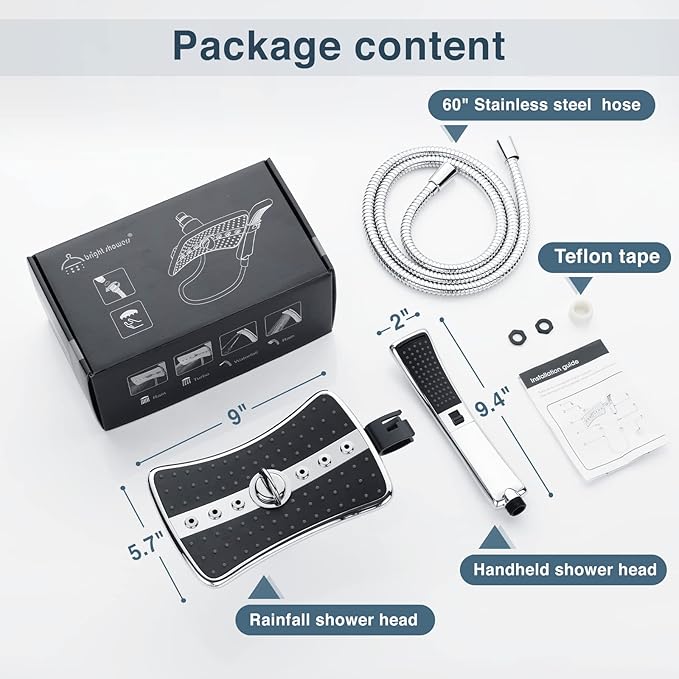 - Rain shower heads combo is packaged in a strong box, perfect as a gift to friends. Package includes: 1*Rain shower head, 1*Handheld shower, 1*60 Inches stainless steel shower hose, 1*Teflon thread seal tape. Please note washers are pre-assembled. No shower arm included in the packaging.