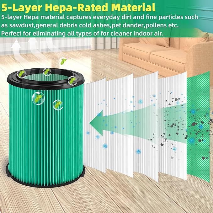 - 5-Layer Pleated:The increased surface area of the vacuum filter makes it less prone to clogging and adsorbs fine particles such as sawdust,dust,sand,drywall dust,powder,etc.,thus making your home or office look spotless