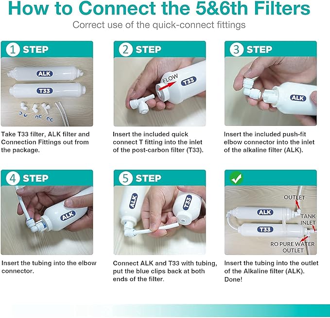 - Tubing Compatibility: The T33 post-carbon and Alkaline (ALK) filters feature 1/4" push-to-connect fittings and are designed for 1/4" PE tubing only. They are not compatible with 3/8" tubing. For 3/8" systems, a separate adapter must be purchased (not included).
