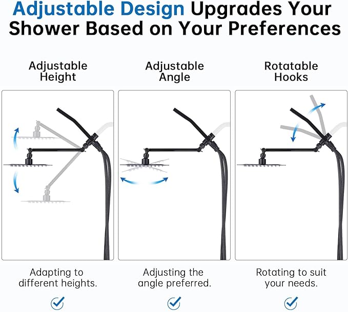 - ►9-INCH SHOWER EXTENSION ARM: Keep the shower head away from the wall. You can adjust the height, distance and angle with two knobs to meet your specific needs. The free spinning locking collar allows you to tighten the extender in a correct position