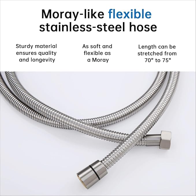 - ►EASY TO INSTALLA AND LUXURY FINISHED: The package come with all the tools needed. The installation only takes minutes to follow the instructions. The hose can be stretched from 70" to 75". it's easy for you to shower yourself, bath your babies, your pets or cleaning the toilet. A good quality hose refuses winding