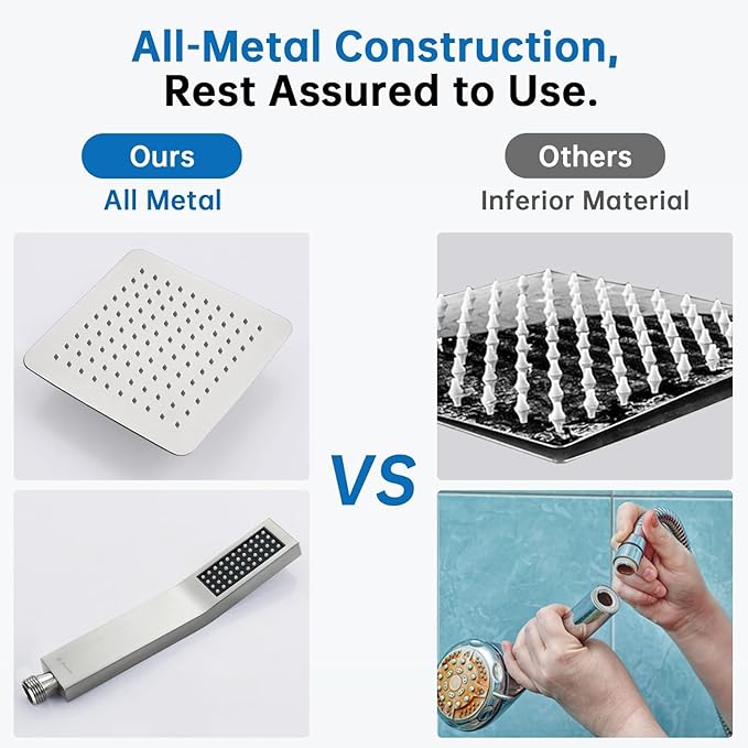 - ►METAL RAIN SHOWER HEAD AND HAND SHOWER WAND: Square design rain shower head and hand shower wand are made from stainless steel and brass. METAL construction is more durable than plastic, and provides a longer service life