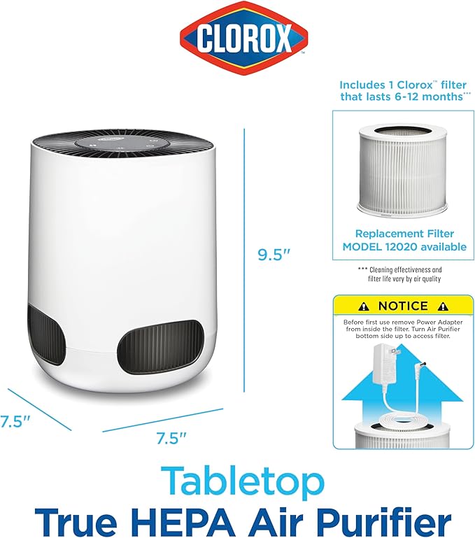 - GENUINE CLOROX FILTERS: Replace the filter every 6 12 months by searching for B09N54QY1R or Clorox 12020 Tabletop Replacement Filter. Maintain optimal performance with True HEPA filtration to capture 99.97% of particles as small as 0.1 microns and a pre filter to capture larger particles.at enter the True HEPA filter.