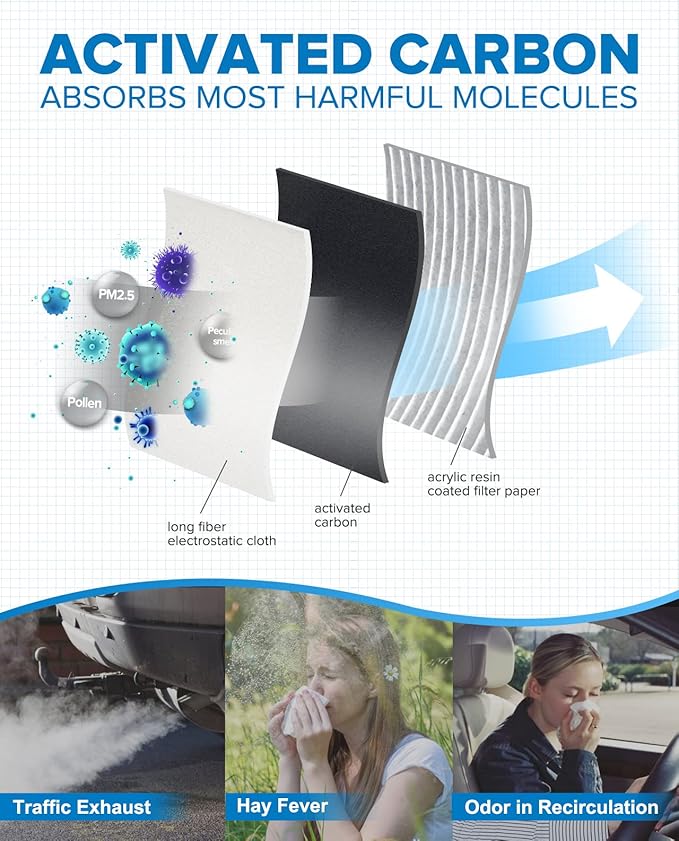 - Enjoy Fresh Air: PHILTOP ACF057 cabin air filter is made of three high-efficiency filter materials: long fiber electrostatic cloth, activated carbon, and acrylic resin coated filter paper, which can filter up 99% of dust, pollen, and other contaminants in the air, provide a comfortable car environment for you and your family