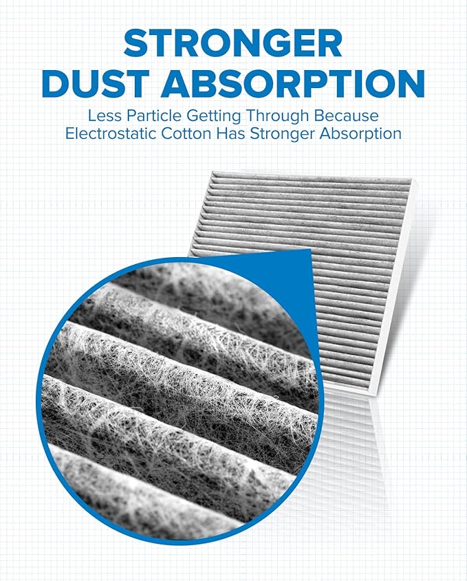 - Enhances HVAC Performance: The special structure of the long-fiber layer electrostatic cotton makes the dust-holding area times higher than other flat materials, with enough gaps for air passage to improve the heating and cooling efficiency of HVAC and prevent musty odors from forming inside the car