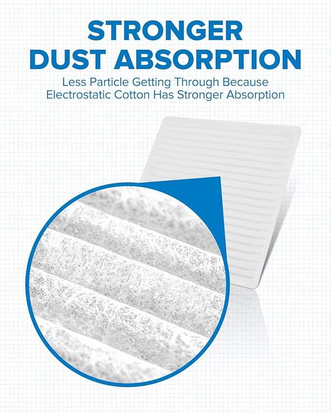 - Enhances HVAC Performance: The special structure of the long-fiber layer electrostatic cotton makes the dust-holding area times higher than other flat materials, with enough gaps for air passage to improves the heating and cooling efficiency of HVAC and prevent musty odors from forming inside the car