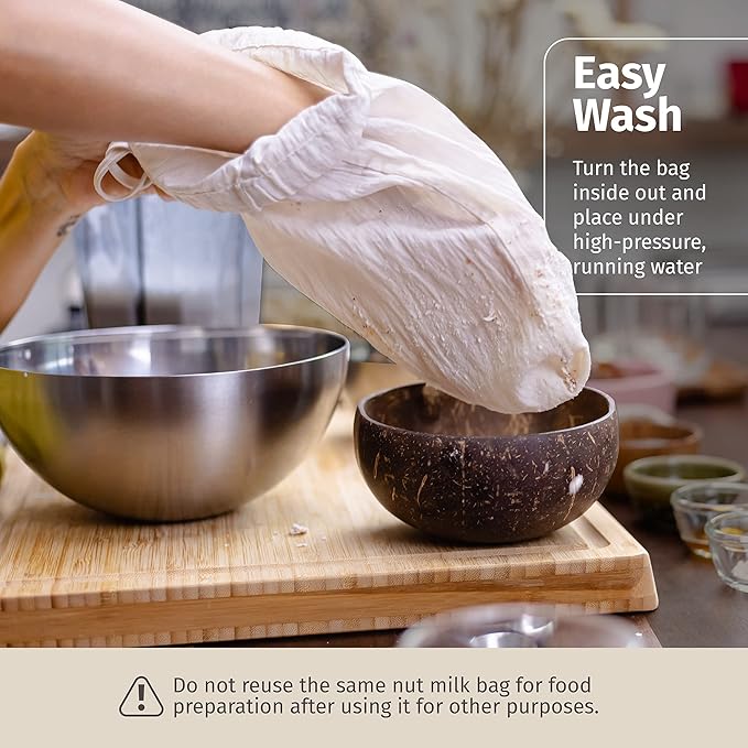 - MINIMAL CLEANUP. Washing this nut milk kit is a breeze. Simply turn the bag inside out and run under high-pressure water to remove the chunks. You can use mild dish soap if desired.